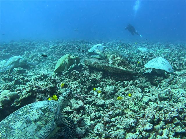 数えきれないほどのウミガメの群れでした。こんなにも多くのウミガメに囲まれてダイビングができるのも、ハワイでのボートダイビングならではです!!