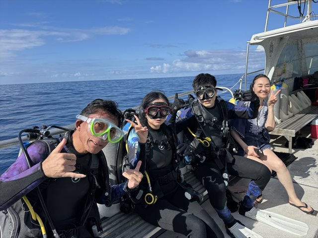 眩しい日差しの中、皆様揃ってのボートダイビングでした。新しいアドバンスドオープンウォーターダイバーも誕生しています。Congratulations!!