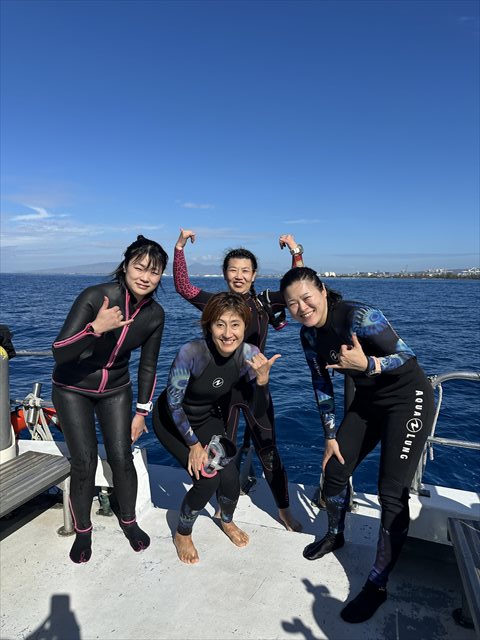 眩しい日差しの中、皆様揃ってのボートダイビングでした。新しいアドバンスドオープンウォーターダイバーも誕生しています。Congratulations!!
