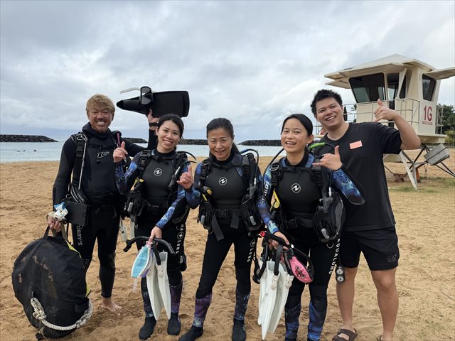 PADIオープンウォーターダイバー おめでとうございます。あいにくの天候でしたが、チームワーク良く頑張っていただけました。この先は世界中の素晴らしい水中世界を楽しんでください!!